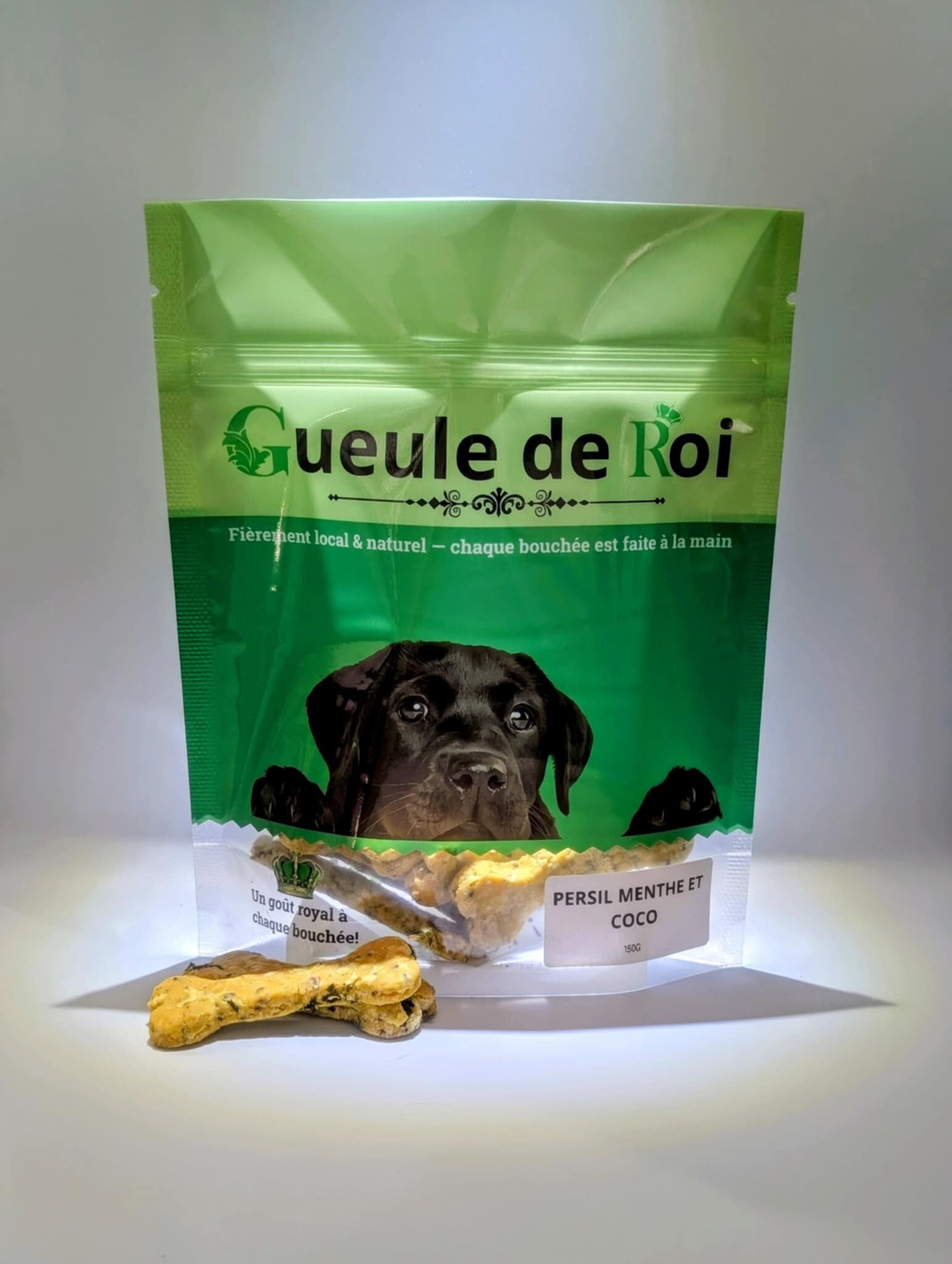 Ces biscuits sont conçus pour rafraîchir l’haleine de votre compagnon tout en lui offrant une gâterie saine et savoureuse. Faits avec du persil frais, de la menthe naturelle et de l’huile de coco, ils aident à garder une bouche propre… et une gueule de roi !